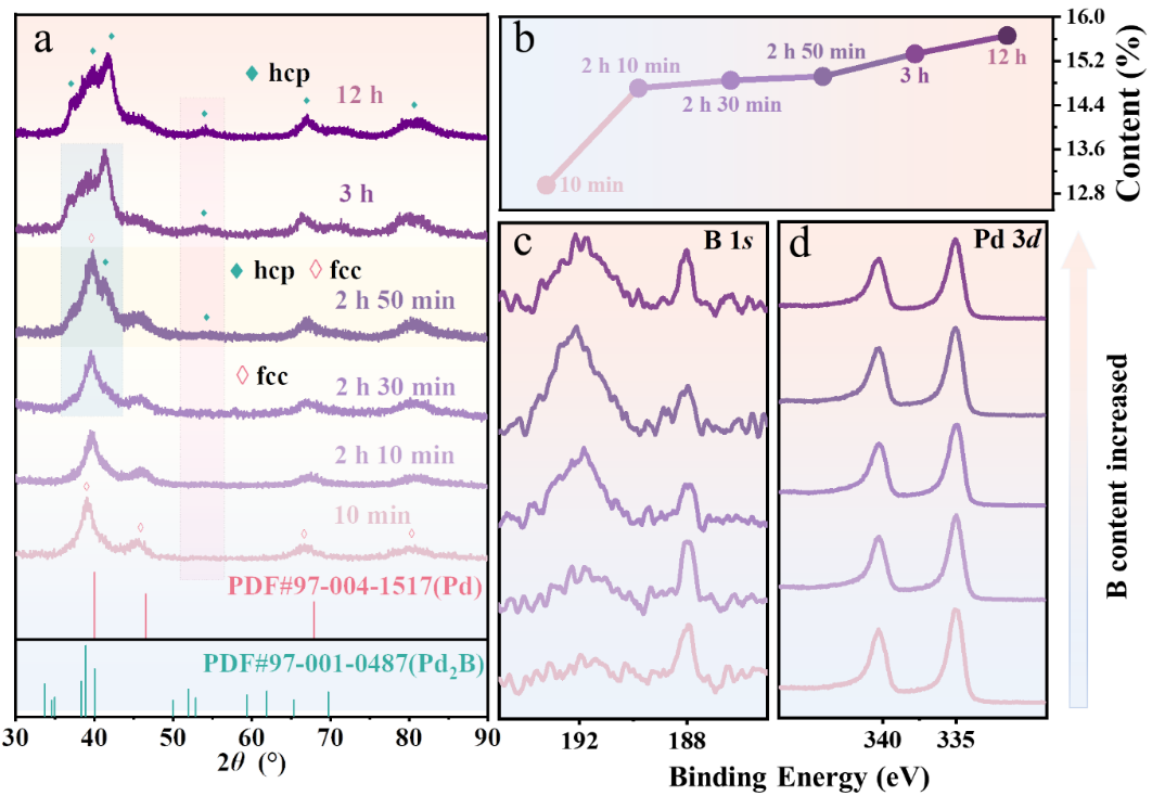直接甲酸燃料电池是一种将甲酸中的化学能连续不断地转化为电能的绿色能源转化装置,具有能量转化效率高、运行安全方便、操作结构简单、发电时间持久等一系列优点。合理调控阳极电催化剂的电子结构和元素组成对于实现高性能直接甲酸燃料电池至关重要。先进能源转化材料与器件研究团队以丁二酮肟钯配合物为前驱体,硼氢化钠为还原剂和硼源,通过简单的化学还原法合成了硼含量可控的钯-硼纳米花。其硼含量可通过控制反应时间来调节,随着硼含量的升高,钯晶格从面心立方转变为六方密堆积。与商用钯和铂纳米晶相比,具有六方密堆积结构的钯-硼纳米花表现出更高的甲酸电氧化反应质量活性和面积比活性,且具有优越的稳定性和抗中毒能力。密度泛函理论计算表明,钯和硼之间的d-sp轨道杂化改变了钯表面的d带特性,从而优化了关键中间体的吸附行为,促进了甲酸电氧化反应动力学。这项研究为金属硼化物材料的简便合成以及在各种电催化反应中的应用提供了理论和实验基础。