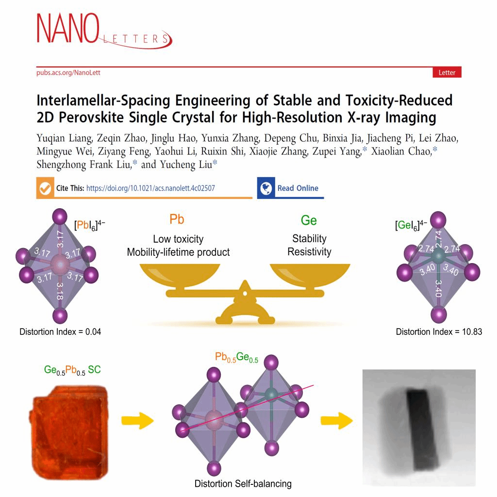 基于此,公司钙钛矿材料与器件团队结合第一性原理计算和晶体结构设计,并基于晶格畸变自平衡的层间距调控策略获得了高稳定且毒性降低的2D钙钛矿单晶。由于该单晶具有高的稳定性、大的载流子迁移率-寿命积,因此使用该单晶制备的探测器实现了高的X射线探测性能,包括高达13488 μC Gy-1 cm-2的探测灵敏度、低至8.23 nGy s-1的检测限以及8.56 lp mm–1的X射线成像空间分辨率,以上性能参数均远优于高毒性的2D结构Pb基钙钛矿探测器。该工作为低成本开发低毒、高性能的X射线探测器提供了新的技术方案。该工作近日发表于国际著名期刊《Nano Letters》上。