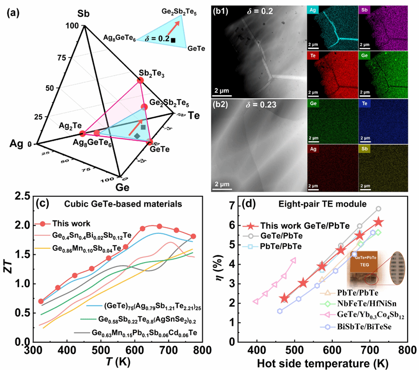 近日,公司铁电功能材料与器件创新团队杨祖培教授、吴笛教授基于相图预测,通过在(GeTe)x(Ag1-δSb1+δTe2+δ)100-x体系中精细调控合金比x和Ag/Sb比值δ, 在保持其立方相结构的同时成功地消除了Ag8GeTe6晶界相,实现了热电性能的显著提升。最终在673 K时获得了~2.0的热电优值,以及~1.5的平均热电优值(323-773 K)。制备的热电器件在480 K温差下实现了6.3%的发电效率和1.32 W的输出功率,属于该体系领先水平。相关研究工作以Promoted thermoelectric performance in cubic-phase GeTe via grain-boundary phase elimination under phase diagram guidance为题,发表在国际材料顶级期刊《Energy & Environmental Science》上,该研究工作为立方相GeTe基热电器件在中温热电发电机中的实际应用提供了强大的推动力。