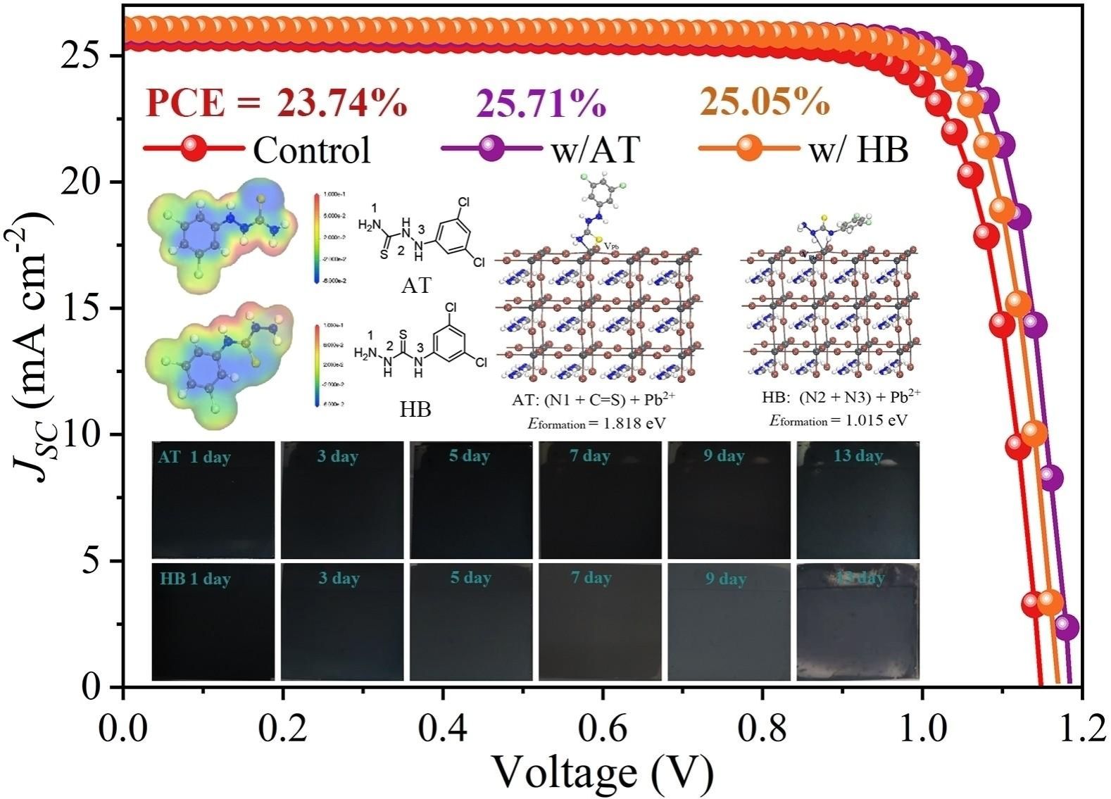 近日,公司刘治科教授团队设计并合成了两种硫脲衍生物异构体[(3,5-二氯苯基)氨基硫脲](AT)和N-(3,5-二氯苯基)肼基羧硫酰胺(HB)。通过对不同分子结构进行深入研究后发现,分子间基团相互作用对于改善钙钛矿缺陷具有重要意义。特别是,在所研究的两种异构体中,AT表现出更强的协同缺陷钝化能力。具体来说,AT能够通过N1和C=S基团与Pb2+缺陷发生有效配位作用,形成高达1.818 eV的缺陷形成能,从而促进了高质量薄膜的形成,包括高结晶度、大晶粒尺寸及低缺陷密度等特点。相比之下,HB由于受到较大空间位阻的影响,在与钙钛矿相互作用时效果较弱。基于上述理论指导,研究人员采用AT处理FACsPbI3基PSCs器件,并将其与对照组及使用HB处理过的器件进行了对比。结果显示,经过AT处理后的器件不仅实现了高达25.71%的光电转换效率(经认证为24.66%),而且展现出优异的稳定性:即使在空气中放置长达2000小时或在最大功率点连续运行1000小时后,仍能保持初始效率的91.0%和95.2%。这些数据充分证明了AT作为一种新型钝化剂的巨大优势。