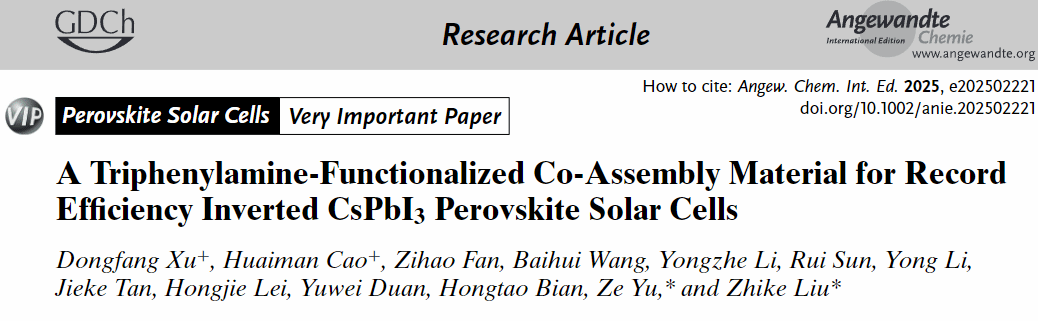 该工作合成了一种新型共组装材料TPAI,通过其与SAM的π-π相互作用以及与钙钛矿的N-Pb相互作用,改善了倒置CsPbI3钙钛矿太阳电池中埋底界面的质量。该工作为制备高效稳定的无机CsPbI3钙钛矿太阳电池提供了一条可行的途径。相关研究成果以“A Triphenylamine-Functionalized Co-Assembly Material for Record Efficiency Inverted CsPbI3 Perovskite Solar Cells”为题,发表在知名化学类期刊《Angewandte Chemie International Edition》上。