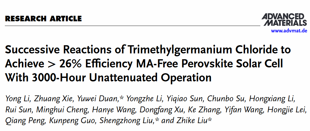 该研究提出了一种基于三甲基氯化锗(TGC)分子的优化策略,通过连续反应机制有效提升无甲胺钙钛矿太阳电池的光电转换效率(PCE)至 26%以上,并实现了 3000 小时无衰减运行。这一成果不仅为钙钛矿太阳电池的高效稳定性提供了新的研究思路,也为其未来的商业化应用奠定了坚实基础。相关研究成果以“Successive Reactions of Trimethylgermanium Chloride to Achieve > 26% Efficiency MA-Free Perovskite Solar Cell With 3000-Hour Unattenuated Operation” 为题发表在材料类知名期刊《Advanced Materials》上。