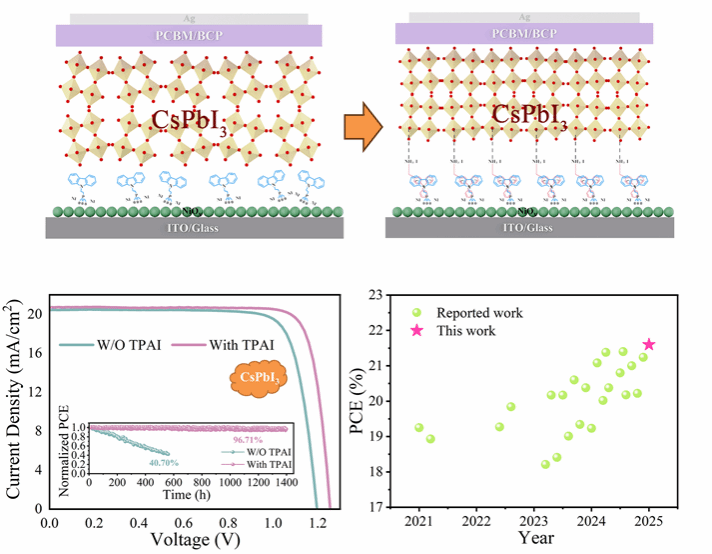 近日,公司刘治科教授团队开发了一种新型三苯胺功能化铵盐TPAI(4-(氨甲基)-N,N-二苯基苯胺碘化物)作为共组装材料用于倒置全无机CsPbI3钙钛矿太阳电池中以实现SAM的有序组装。密度泛函理论(DFT)计算和和频振动(SFG)分析表明,TPAI可以通过π-π相互作用与SAM结合,有效改善SAM在表面的有序组装。此外,通过傅里叶变换红外光谱(FTIR)、X射线光电子能谱(XPS)和扫描电子显微镜(SEM)表征证实,共组装的TPAI可以通过–NH3和Pb的相互作用与上层的钙钛矿结合,这有助于钙钛矿溶液的铺展,从而提高钙钛矿薄膜的质量。因此,经过TPAI处理的器件实现了1.26 V的高开路电压(VOC)和21.60%的光电转换效率,这是目前报道的倒置CsPbI3 PSCs的最高效率。此外,TPAI处理的器件表现出良好的运行稳定性,在最大功率点(MPP)下跟踪1400小时后,仍保持了初始效率的96.71%。