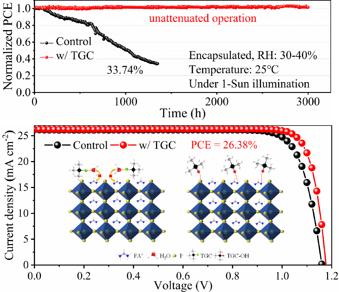 钙钛矿太阳电池凭借其优异的光电特性,近年来受到科研人员的广泛关注。在短短的十几年时间内,其光电转换效率(PCE)已从最初的3.8%迅速提升至26.7%,展现出极大地光伏应用前景。然而,在钙钛矿薄膜的制备过程中,水分的侵蚀会导致钙钛矿相的不稳定性,从而显著降低器件的长期稳定性。针对这一问题,本研究引入三甲基氯化锗(TGC)分子,其能够优先与空气中的水分结合,从而有效保护钙钛矿中的有机阳离子,增强薄膜的环境稳定性。此外,TGC分子还能够降低钙钛矿的成核能垒,促进晶粒的均匀生长,制备出大尺寸、低缺陷密度的高质量薄膜。通过这一简便的添加剂策略,实现了对钙钛矿薄膜的结晶调控、缺陷钝化及稳定性提升,最终制备出兼具高效率与超高稳定性的钙钛矿太阳电池。