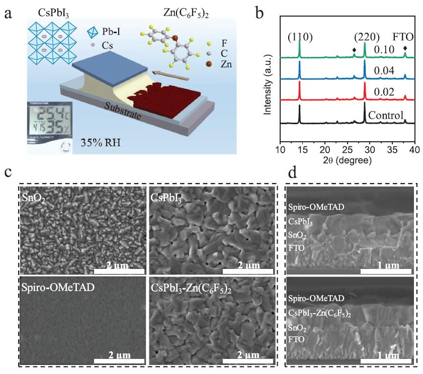 近日,云顶国际vip8866赵奎教授(刘生忠教授团队)联合阿卜杜拉国王科技大学Thomas D. Anthopoulos教授发现了空气中低温印刷的CsPbI3太阳能电池。通过引入低浓度的多功能分子添加剂Zn(C6F5)2,可以降低快速结晶成膜导致的能级失配和陷阱密度,从而实现高质量的CsPbI3钙钛矿薄膜。结果表明:添加剂倾向于在CsPbI3/SnO2界面附近积累,减少了150 meV的能级差异;同时添加剂在钙钛矿表面上也有强烈的化学吸附,减少了陷阱密度。因此空气中印刷的太阳能电池获得了19%的能量转换效率。