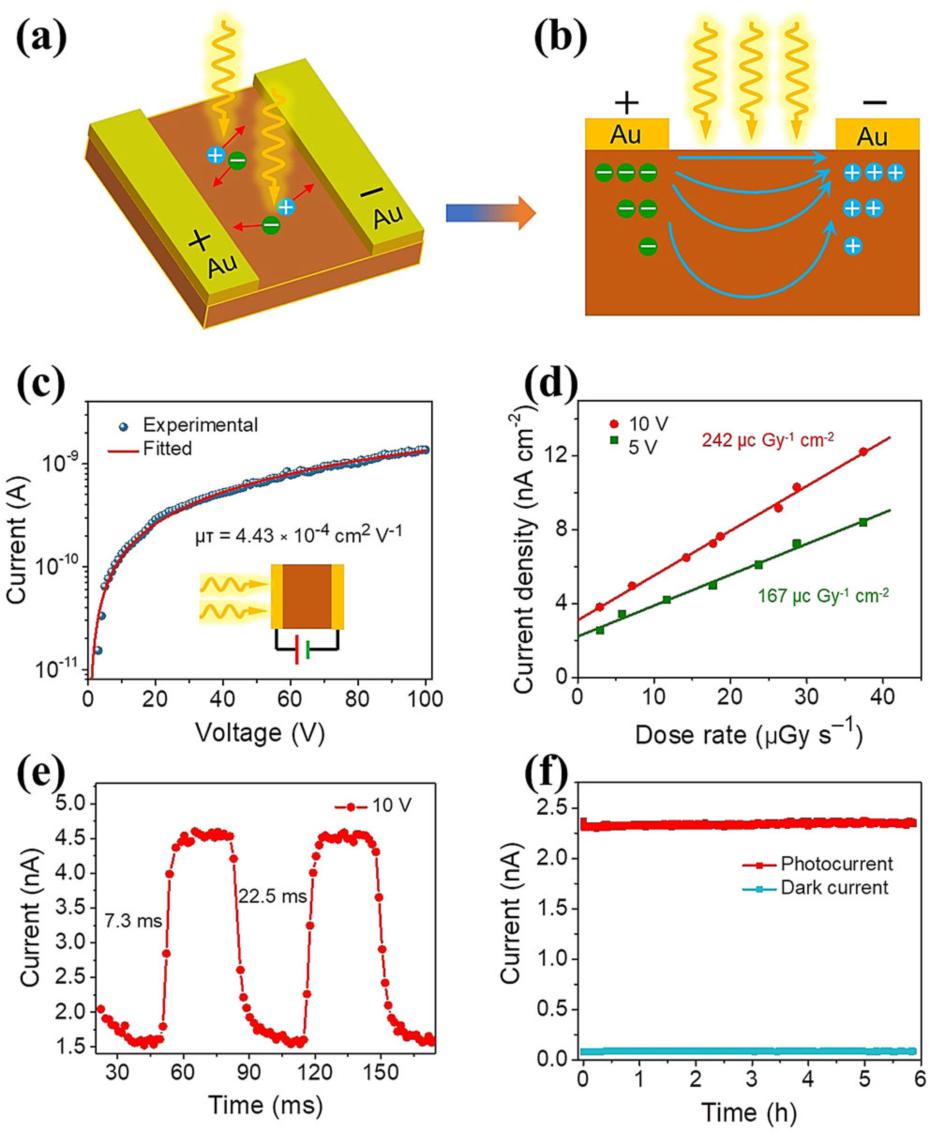 近日,云顶国际vip8866赵奎教授(刘生忠教授团队)联合南京工业大学陈永华教授采用了了一种优化的降温结晶方法(modified temperature crystallization method),成功生长出厘米尺寸的二维结构钙钛矿(BDA)PbI4单晶。光电性质研究表明(BDA)PbI4单晶的缺陷态密度低至3.1×109 cm-3,基于(BDA)PbI4单晶材料的X射线探测器获得了242 µC Gyair-1 cm-2的灵敏度、430 nGyair s-1的低探测极限、7.3 ms的短响应时间、6.06 ×10-9 nA cm-1 s-1 V-1的低暗电流基线漂移、以及较好的稳定性。上述结果说明基于直链双胺阳离子的AA′n−1MnX3n+1型二维钙钛矿单晶在X射线探测方面具有较大的应用研究价值。