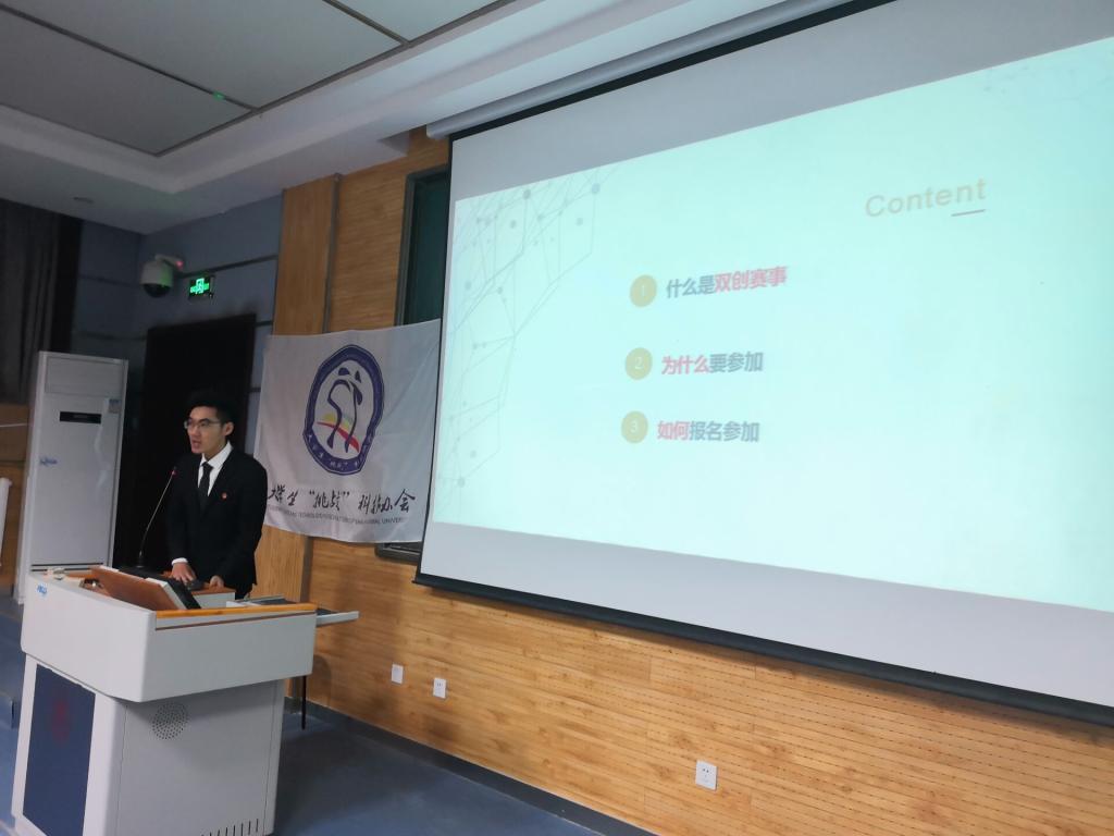 首先,来自地理科学与旅游公司的路鹏飞同学,他向同学们清楚的介绍了“挑战杯”、“创青春”和“互联网+”这三种竞赛,并结合自身的经历,简单明了的指出了这三种竞赛的区别;接着,他从赛程的设置、参加竞赛的好处、在大学前三年的每个阶段,应该做哪些具体的准备等做了详细的介绍。