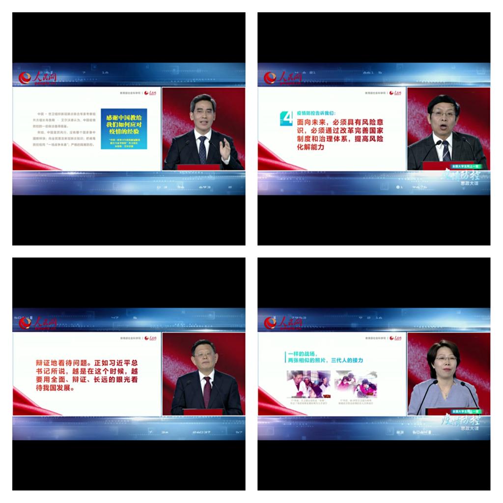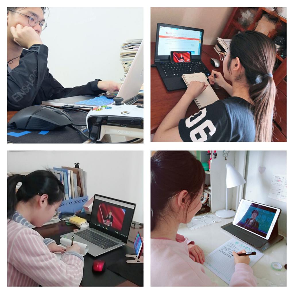 公司各年级分别采取了不同形式的学习,其中2019级全体本科生同辅导员一起,通过“腾讯会议”共同在线学习;2018级本科生以班为单位,由各班班长组织全班同学集体学习;2016级和2017级本科生因上课冲突未能观看直播学习,辅导员高度重视,安排全体同学以宿舍为单位,后续通过回放认真做好观看学习。本次一场特殊的思政课,虽然由于网络等原因对同学们顺利观看造成了一定的影响,但也丝毫没有影响大家学习的热情。同学们耐心等待,认真聆听四位教授的讲述,从人与自然的关系,全球战疫共同体到党和国家在疫情中的强大领导力,从总结历史经验到当代青年如何担当责任,每一个话题都引发了同学们的思考,大家在班级群,Bb平台上积极发表看法,互相交流探讨,每个人都从这节课学习到了东西。这节规模浩大的网上思政课带给同学们的东西,已经远超知识本身。
