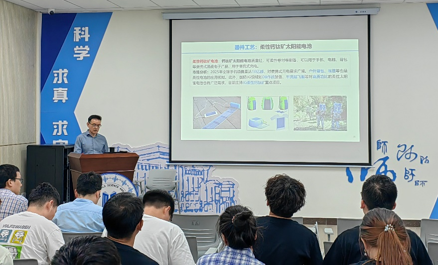 葛子义研究员以“高效柔性钙钛矿太阳电池产业化研究”为题,系统阐述了钙钛矿电池的发展历程以及当前所面临的关键技术难题,针对柔性钙钛矿太阳能电池的基本工作原理、技术优势、最新的研究进展和商业化发展前景进行了深入的介绍。葛子义研究员分享了课题组针对高效柔性钙钛矿电池开发当中,有关新型传输层材料设计、钙钛矿组分调控、界面优化改性等方面所做出的工作,为高性能柔性光伏电池的开发提供了新的见解。同时,报告中葛子义研究员也对柔性钙钛矿太阳能电池的产业化之路提出了自己的见解,并为在座师生的科研和学术工作以及未来的职业发展提供了诸多有价值的建议。