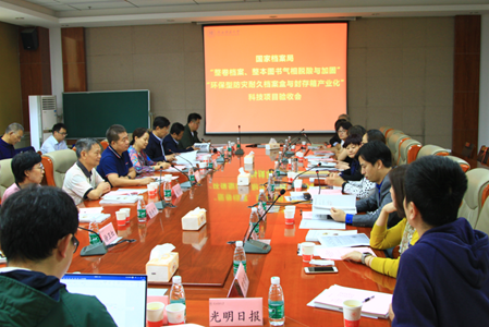 2019年9月18日-19日,公司李玉虎教授团队承担的“档案无公害整体脱酸加固与杀虫灭菌同步关键技术”以及“环保型防灾耐久档案盒与封存箱产业化”两项档案科技项目的验收会在公司长安校区致知楼1568室召开。国家档案局副局长付华,中共陕西省委办公厅副主任、陕西省档案局局长明平英、副局长郑惠姿,公司副董事长杨祖培、科学技术处和公司领导参加了会议。会议由国家档案局技术部主任黄丽华主持。