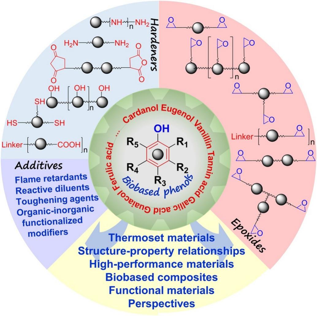 为此,近年来基于可再生生物基单体酚类化合物的环氧树脂引起广泛关注,并在某些具体场合显示出替代双酚A环氧树脂的潜力。近日,公司云顶国际vip.888历史文化遗产教育部工程研究中心胡道道教授、万金涛副教授团队系统综述了近年来基于生物基单体酚的热固性环氧树脂研究进展,以衍生环氧树脂分子结构和化学转化路线为主线,全面梳理和回顾有关的环氧树脂单体、预聚物、固化剂、添加剂和复合材料的研究,并对所得热固性环氧树脂材料的结构和性能进行了综合评论,最后展望了未来研究中的挑战和机遇。相关成果以“Epoxy thermosets and materials derived from bio-based monomeric phenols: Transformations and performances”为题发表在高分子领域国际顶尖期刊《Progress in Polymer Science》(CiteScore=41.1,Impact Factor=22.62),该论文公司为第一单位,参与单位有华南理工大学、化学工程联合国家重点实验室(浙江大学)、江苏科技大学和西班牙马德里高等材料研究所,第一作者和通讯作者为公司云顶国际vip.888万金涛副教授,马德里高等材料研究所王德义高级研究员为共同通讯作者。