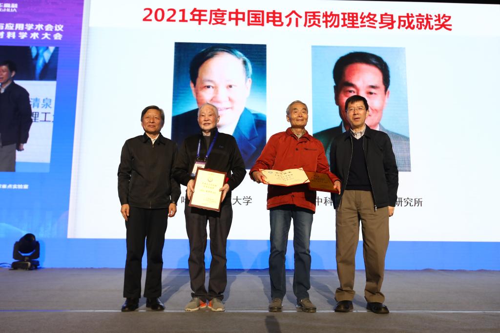 随后,中国物理学会电介质物理专业委员会举行颁奖仪式,仪式由专业委员会副主任委员、四川大学朱建国教授主持。朱教授介绍,为了促进电介质物理及相关学科发展,激励科技工作者为为国家和社会进步作出贡献,学会从第十五届(2014年)全国电介质物理、材料与应用学术会议开始,设立终身成就奖、杰出贡献奖和优秀青年奖等系列奖项。雷清泉院士(哈尔滨理工大学)、殷庆瑞研究员(中科院上海硅酸盐研究所)获本届终身成就奖;周济院士(清华大学)、罗豪甦(中科院上海硅酸盐研究所)获本届杰出贡献奖;易志国(中科院上海硅酸盐研究所)、郝喜红(内蒙古科学技术研究员)、赵晋津(石家庄铁道大学)、廖敏(西安电子科技大学)获本届优秀青年奖。