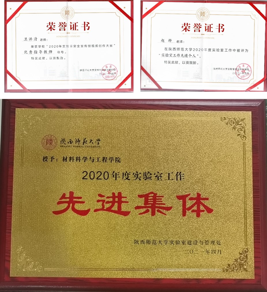 由于公司党政领导对实验室安全管理工作的高度重视,广大教师的不懈努力以及研究生的规范操作,在最近召开的公司2021年度实验室安全工作会议上,公司荣获“2020年度实验室工作先进集体”,赵桦荣获“实验室工作先进个人”等称号。另外,由卫洪清老师指导、研究生袁鹏、朱英、朱晓艳、牛斐、韩喜盈、郭瑞等人参与创作的“实验室安全隐患与防护”微视频获实验室安全宣传微视频创作大赛一等奖(http://matervr.snnu.edu.cn/__local/2/8E/57/BDFB63370DEA45BF92699F578E9_33092188_138C25C.mp4?e=.mp4)。