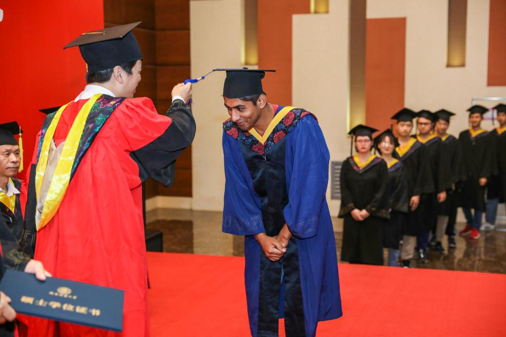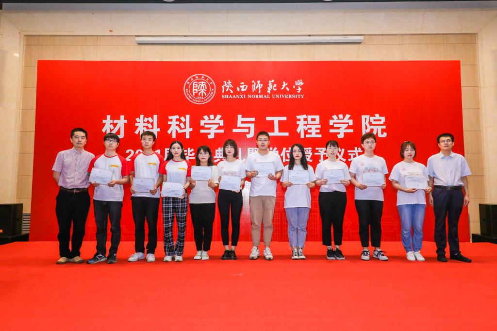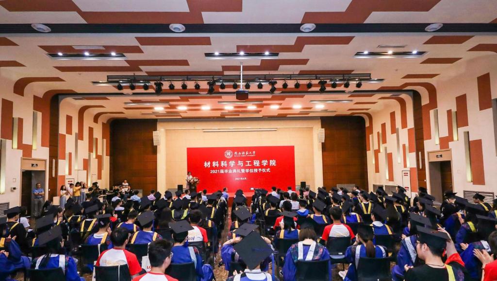 第二个环节是学位授予仪式。在校歌环绕的会场,进行了庄严又隆重的学位授予仪式,材料学分会主席陈新兵教授、分会委员刘生忠教授、分会委员刘宗怀教授为每一位毕业生颁授学位并合影留念。