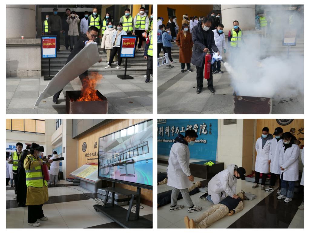 演练还开展了灭火演练、心肺复苏和紧急救助等活动。董湃教官向师生演示了二氧化碳灭火器、灭火毯等消防器材的功能及使用方法,并指导师生进行实践操作;公司联系了北京欧倍尔软件技术开发有限公司利用情景体验式灭火仿真软件,通过VR头盔和仿真灭火器塑造出虚拟环境供师生体验;体育公司实验室刘弢主任和孙丽君老师就心肺复苏和除颤仪进行讲解和演示;校医院雷琦医生、王帆护士就烧伤、烫伤后的紧急处理方法向师生进行了讲解。