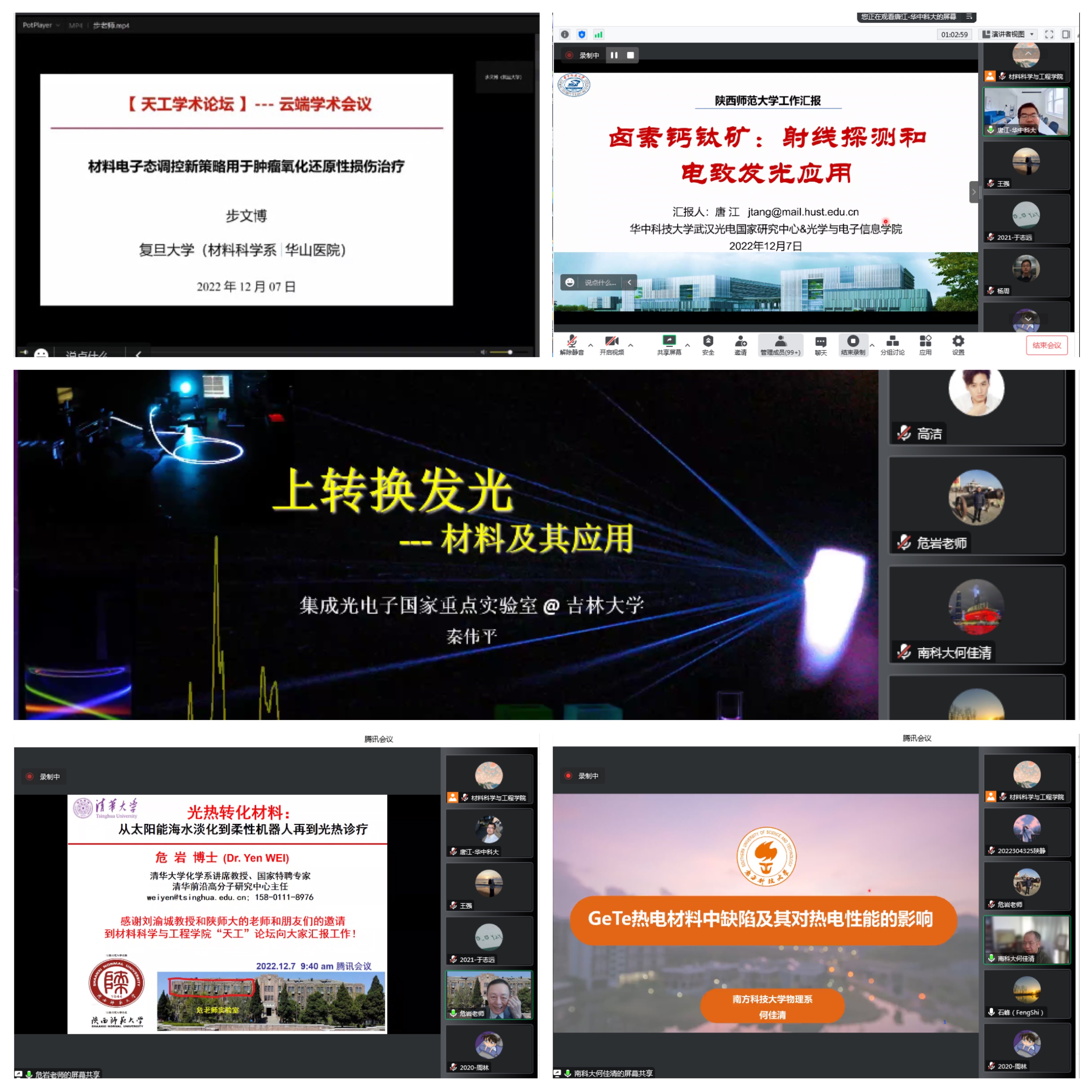 华中科技大学唐江教授、清华大学危岩教授、复旦大学步文博教授、南方科技大学何佳清教授、吉林大学秦伟平教授分别做了《卤素钙钛矿:射线探测和电致发光应用》《光热转化材料:从太阳能海水淡化到智能机器人再到光热诊疗》《材料电子态调控新策略用于肿瘤氧化还原性损伤治疗》《GeTe热电材料中缺陷及其对热电性能的影响》《上转换发光:材料及其应用》等专题汇报,结合各自的研究领域、研究进展和发展前景进行了重点汇报。