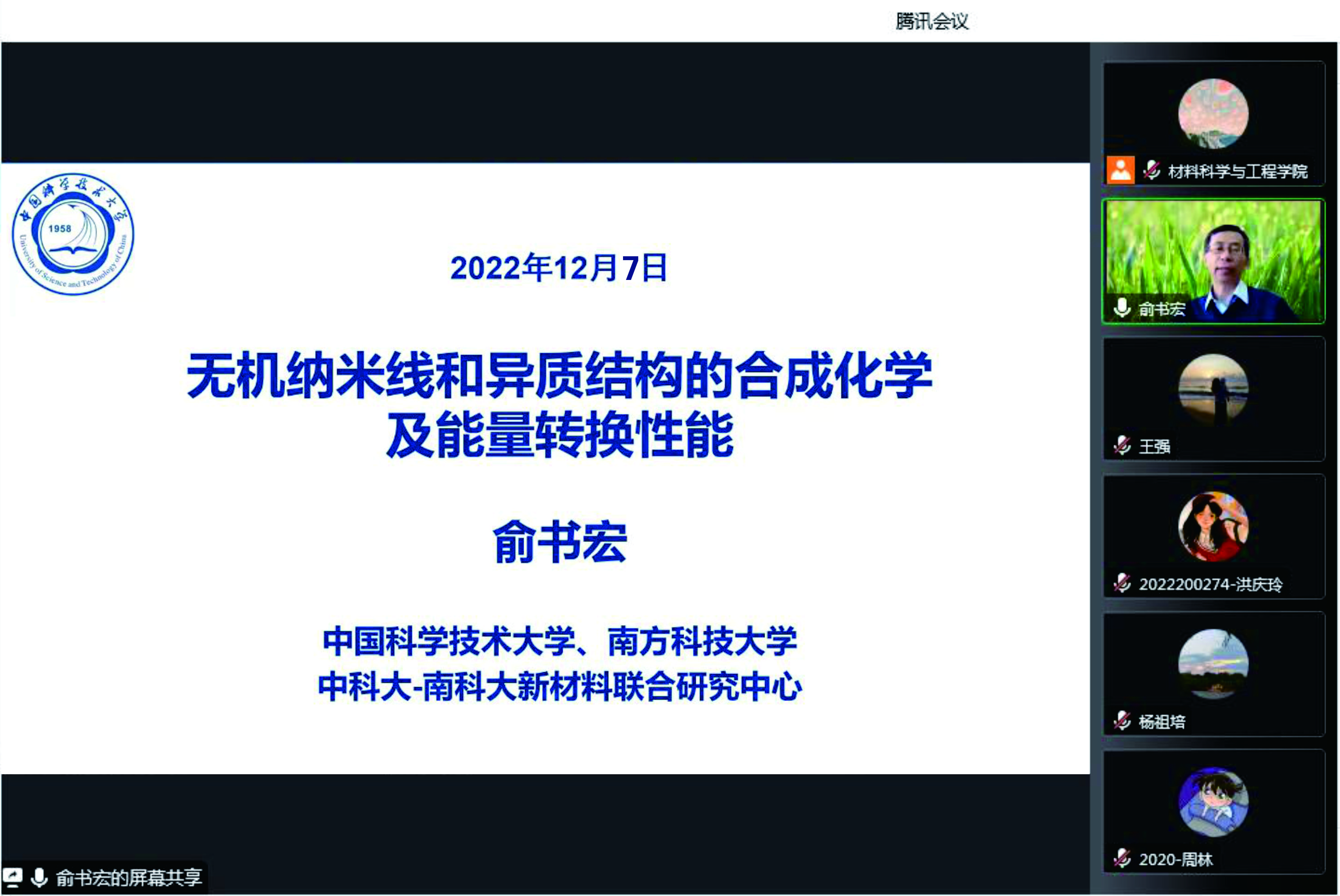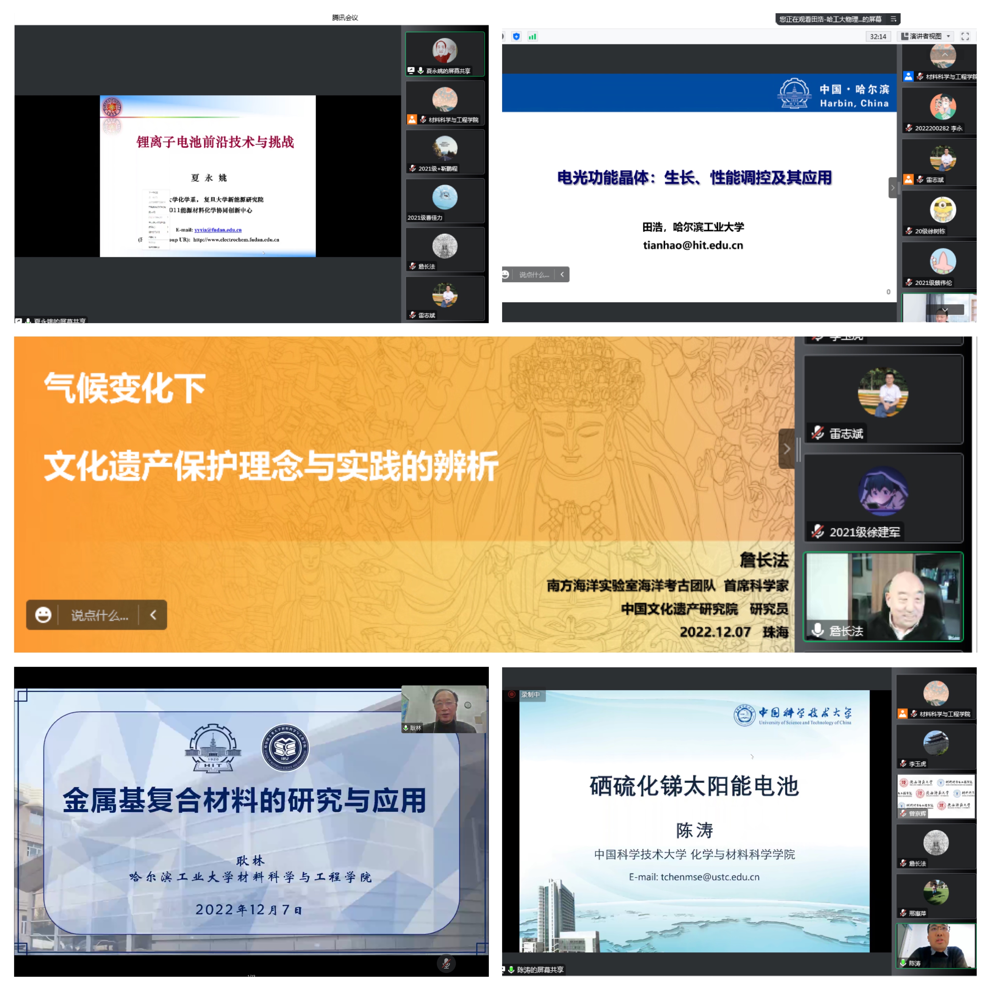 报告内容包括:夏永姚教授详细介绍了锂离子、钠离子电池储能原理及存在的问题,重点介绍了团队近年来在低温电池方面的研究进展,并提出了锂离子电池的未来发展趋势。耿林教授团队利用金属基体复合陶瓷材料设计,显著提升了材料的综合性能,成功建立了从材料理论研究、成型、加工到应用的研发模式。田浩教授团队利用不同光学或电学手段诱导构筑材料微结构,实现了系列新型光学材料的高性提高,并基于研究结果开发了光学测试仪器,成功应用于相关材料测试。詹长法研究员从文化遗产保护理念、国际合作、现代科技手段的利用、文化遗产风险评估等方面进行了详细阐释介绍,号召持续推进文化遗产保护事业,传承我国优秀传统文化。陈涛教授团队以硒硫化锑太阳能电池为研究对象,通过制备高质量硒硫化锑薄膜,实现了光电转换效率>10.0%的突破,使硒硫化锑成为继有机/无机杂化钙钛矿之后又一效率超过10%的光伏材料。