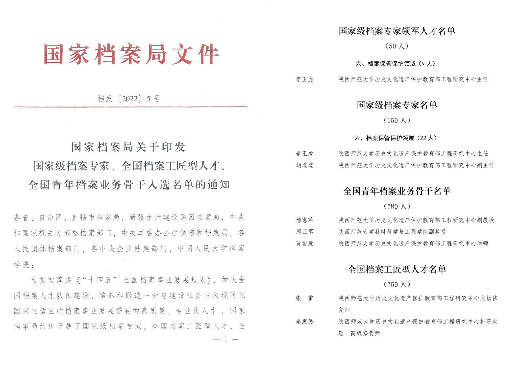 近年来,公司历史文化遗产保护教育部工程研究中心深入贯彻落实习近平总书记关于人才工作重要指示精神,秉承“育才是发展第一要务”的理念,按照历史文化遗产保护的内涵、规律与实际需求,大力培养中青年档案保护、文物保护业务骨干。培养的博士、硕士不仅在中国第一历史档案馆、南京博物院、大足研究院、湖北博物院、四川博物院、山东博物馆、天一阁博物馆等全国几十家文博单位成为科研骨干,有的入选江苏省“三、三、三拔尖人才”、“重庆市担当作为好干部”,有的被中央电视台报道。2022年,有3名中心培养的博士后以副教授身份入职西北工业大学。